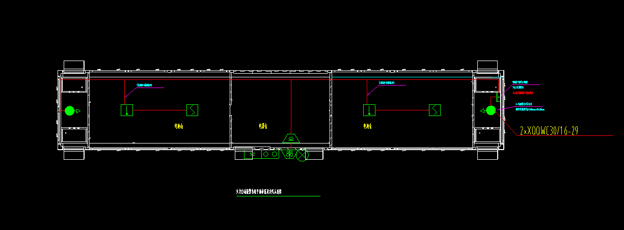 此次集裝箱有一套 45 尺規(guī)格,通過客戶提供的圖紙,振興消防工程師連夜著急工程師進行開會討論,由負責(zé)的工程師連夜趕制出方案發(fā)給客戶,又和客戶的交流溝通中修改了N 次,最終確認了方案達成合作。根據(jù)《氣體滅火系統(tǒng)設(shè)計規(guī)范》GB50370、《氣體滅火系統(tǒng)施工及驗收規(guī)范》GB50263、《火災(zāi)自動報警系統(tǒng)設(shè)計規(guī)范》GB50116 中的要求,這套儲能集裝箱消防系統(tǒng)由七氟丙烷滅火裝置、藥劑釋放管路和火災(zāi)探測報警三大部分組成,根據(jù)集裝箱規(guī)格,設(shè)計采用 兩個30L 七氟丙烷滅火裝置,充裝 58KG 滅火藥劑,配置 2個感溫探測器和2 個感煙探測器與火災(zāi)報警主機等形成一套完整的滅火系統(tǒng)。同時和業(yè)主的結(jié)構(gòu)工程師一起交流確定儲能集裝箱外部報警設(shè)備能夠正常按照他們的箱體進行設(shè)計保護;內(nèi)部管道固定方式;滅火裝置如何固定在運輸中才會更牢靠以及如何實現(xiàn)發(fā)生火災(zāi)報警信號傳達給業(yè)主等細節(jié)。CAD 平面圖如下: