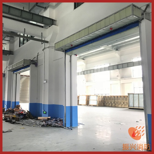 特別研制的機(jī)械傳動裝置在防火電機(jī)的提升作用下將無機(jī)簾布折上升到洞口的頂部,能解決U型、L型、弧型以及特大跨度防火分區(qū)的防火分隔。